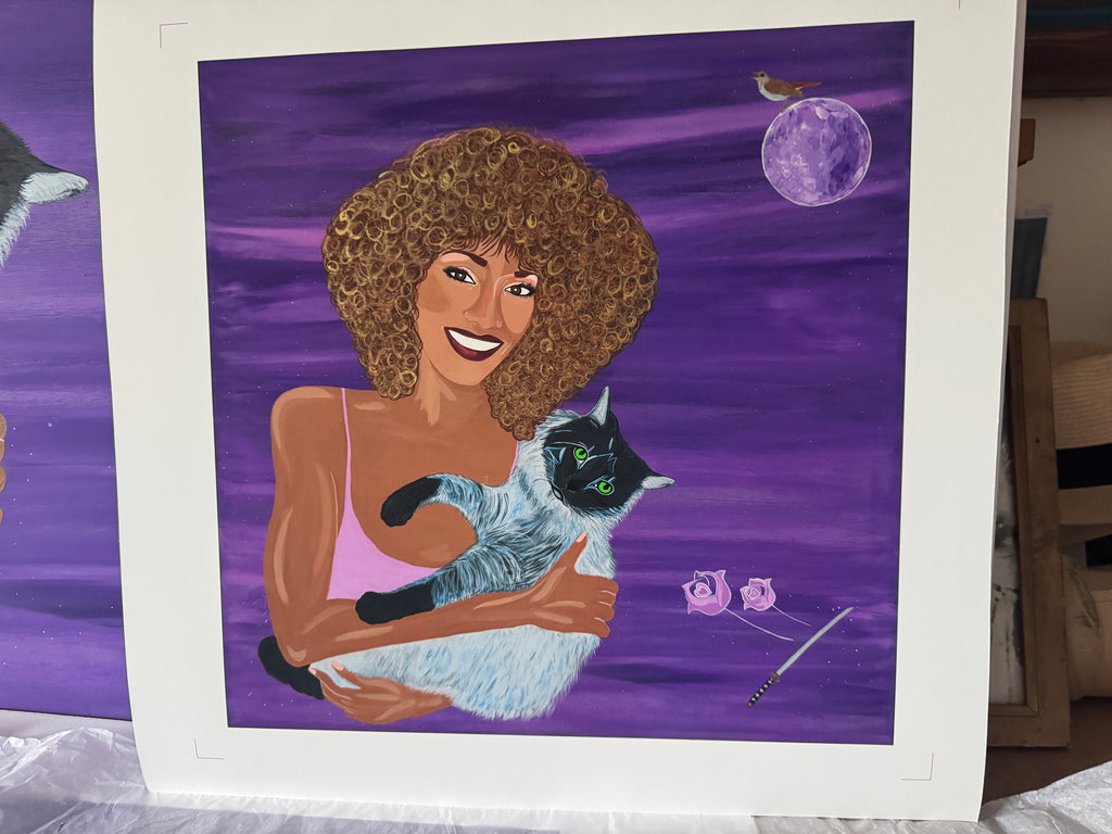 It is 14 years since the unfathomable death of Whitney Houston. This is my tribute to her. She was a creative genius with an otherworldly voice. I've painted her with her deeply loved cat, MisteBlue. Eternal light shines upon her spirit.